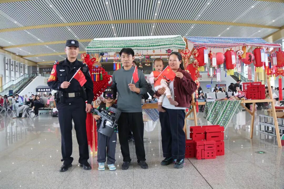 候車大廳內(nèi),紅色的國(guó)旗與中秋元素裝飾隨處可見。志愿者向旅客熱情遞上文旅宣傳冊(cè),介紹紅河州特色景點(diǎn)與動(dòng)車出行攻略。精彩的民族歌舞表演吸引了旅客紛紛駐足,他們舉起手機(jī)記錄下精彩瞬間。