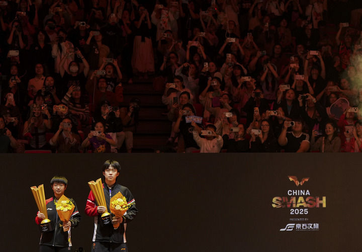 10月3日,在北京舉行的2025年世界乒乓球職業(yè)大聯(lián)盟(WTT)中國大滿貫賽混合雙打決賽后,冠軍中國組合王楚欽(右)/孫穎莎在頒獎(jiǎng)儀式上。新華社記者 鞠煥宗 攝
