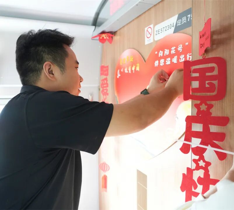 車廂內(nèi)掛滿條幅、彩帶和中國(guó)結(jié),洋溢著節(jié)日的喜慶氛圍。在舞蹈《親愛的你啊》的優(yōu)美旋律中,列車聯(lián)歡拉開序幕。