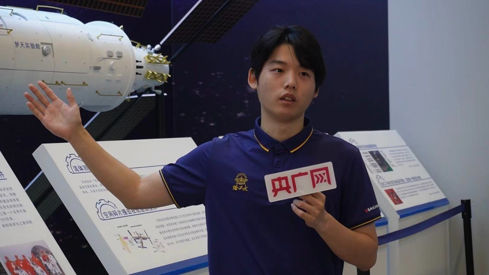 學(xué)生講解員郭鎮(zhèn)宇介紹由哈工大參與研制的問天實(shí)驗(yàn)艙小機(jī)械臂(央廣網(wǎng)發(fā) 王語(yǔ)詩(shī) 攝)
