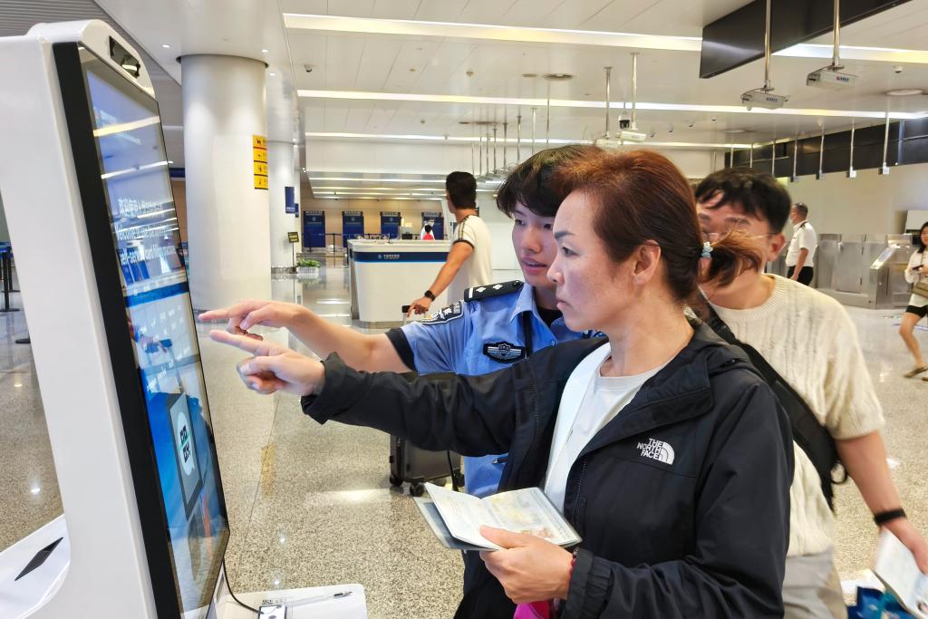 10月1日,在重慶江北國際機場,重慶出入境邊防檢查總站民警幫助韓國旅客填寫入境信息。新華社發(fā)(曾言延 攝)