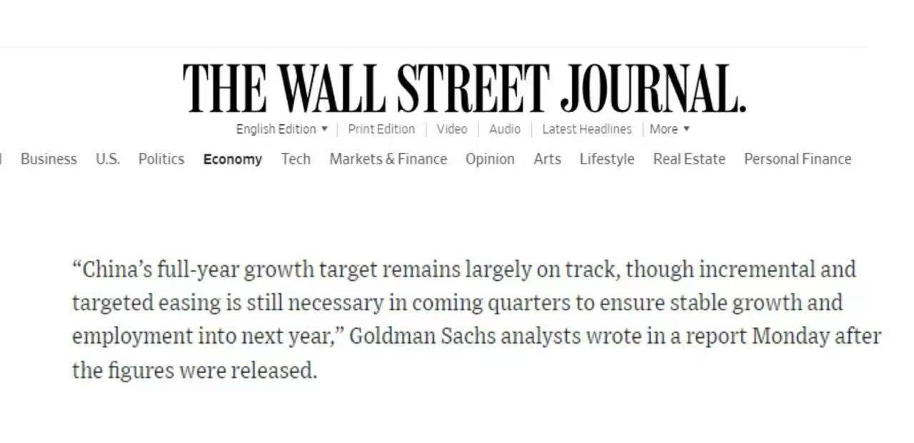美國《華爾街日報(bào)》報(bào)道顯示,2023年前三季度中國GDP同比增長5.2%,意味著"5%左右"的年度增長目標(biāo)已基本達(dá)成。報(bào)道援引高盛分析師觀點(diǎn)稱,雖然未來幾個(gè)季度仍需實(shí)施漸進(jìn)式、結(jié)構(gòu)性的寬松政策,但全年經(jīng)濟(jì)增速仍將總體符合預(yù)期。