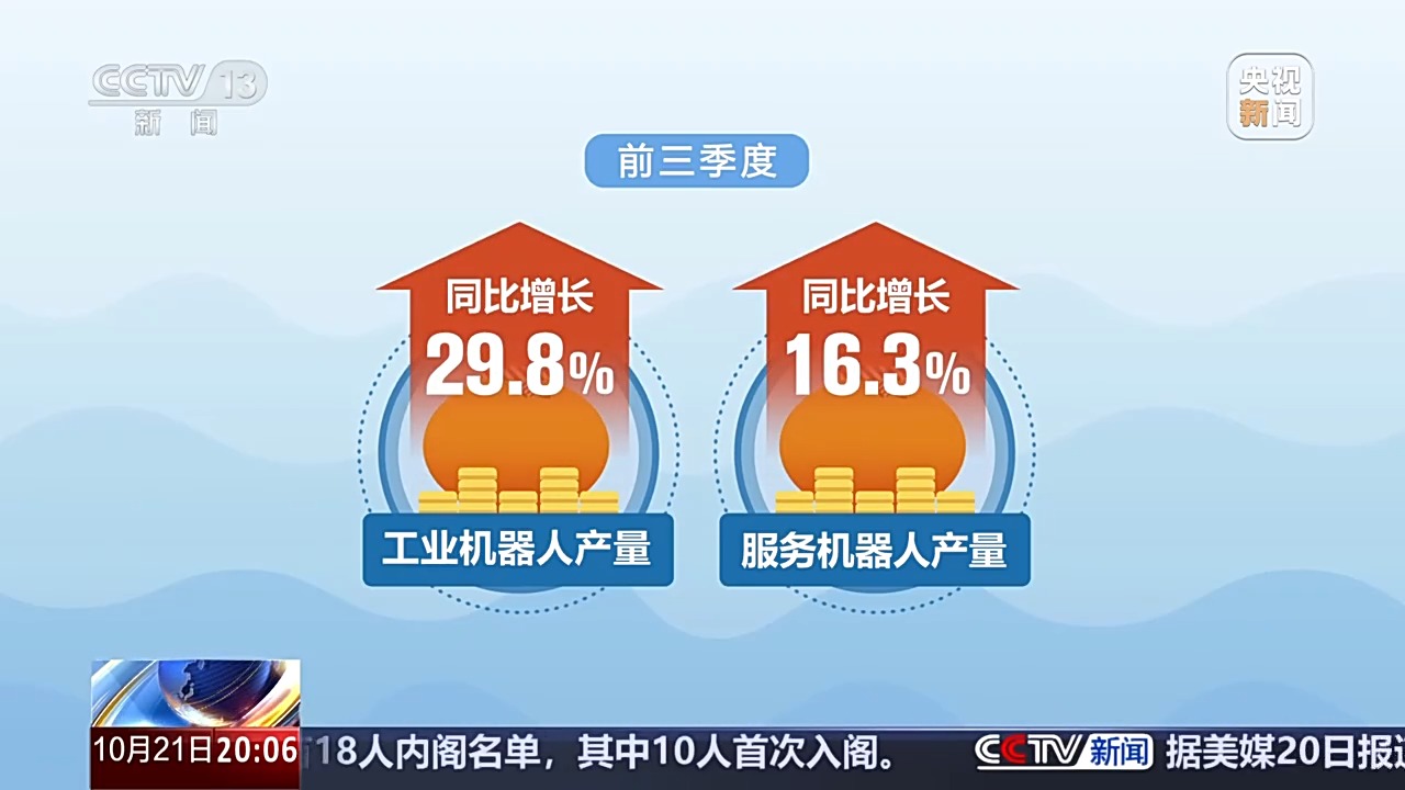 第三季度,我國規(guī)模以上高技術制造業(yè)增加值同比增速明顯快于全部工業(yè);信息傳輸、軟件和信息技術服務業(yè)增加值增長11.7%,比上年同期加快1.7個百分點。前三季度,規(guī)模以上高技術制造業(yè)增加值同比增長9.6%;工業(yè)機器人、服務機器人等產品產量分別增長29.8%、16.3%。