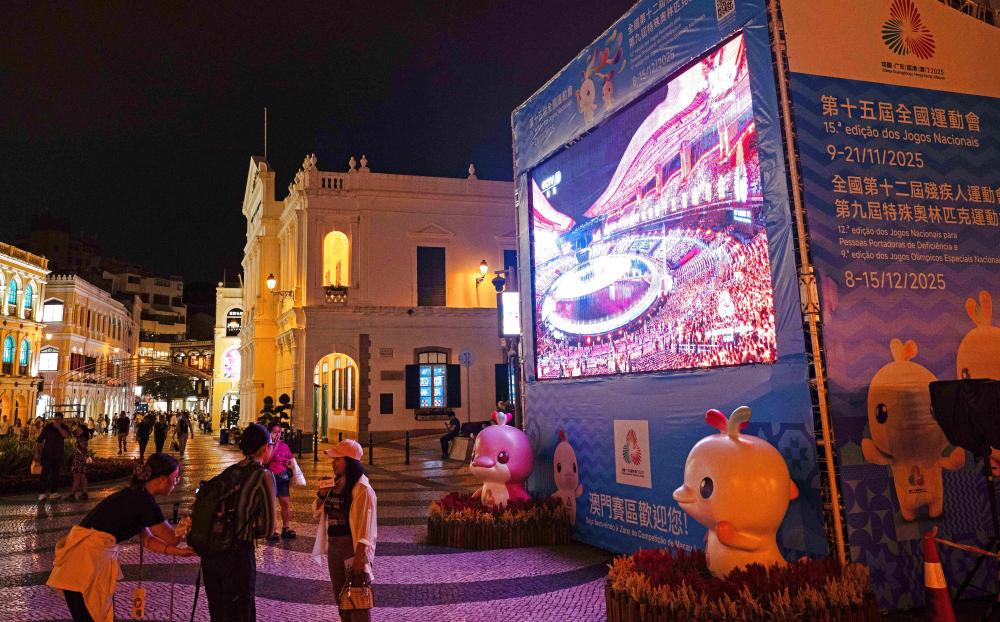 11月9日,群眾在澳門議事亭前地觀看第十五屆全國運(yùn)動(dòng)會(huì)開幕式直播。