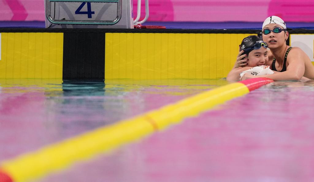 11月11日,河北隊(duì)選手于子迪(左)在女子200米個(gè)人混合泳決賽后與浙江隊(duì)選手余依婷擁抱致意。
