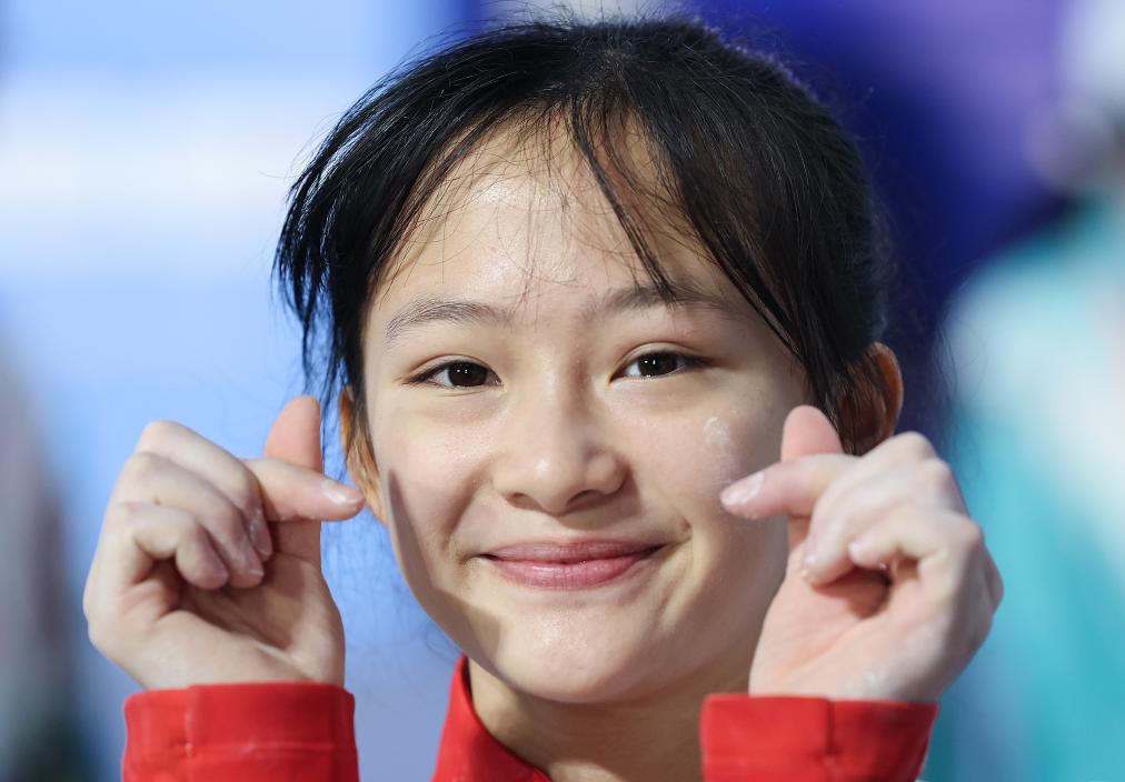11月15日,廣東隊(duì)選手李美妮在女子攀石頒獎(jiǎng)儀式前。