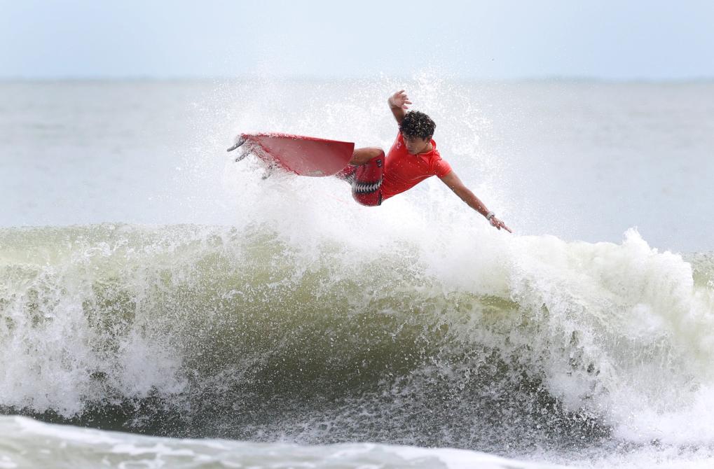 11月13日,河南隊(duì)選手張家昊在沖浪男子短板第一輪比賽中。