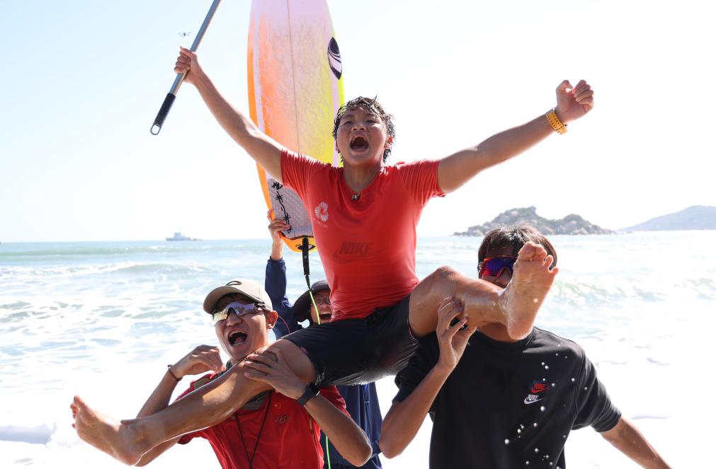 11月16日,四川隊(duì)選手楊思琪(上)在沖浪女子短板決賽后慶祝。