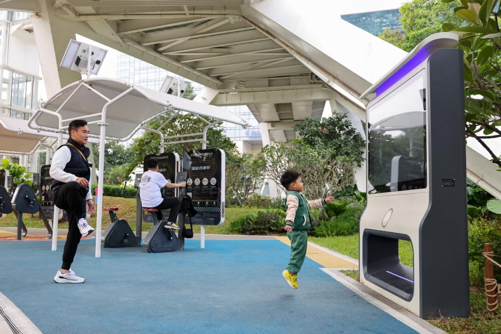 2024年12月27日,在深圳筆架山公園里,小朋友和家長一起使用智能互動(dòng)屏鍛煉身體。