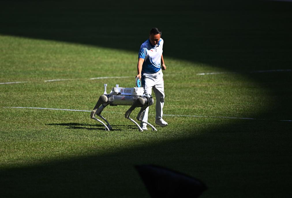 11月16日,在田徑男子十項(xiàng)全能鐵餅比賽中,機(jī)器人在運(yùn)送鐵餅。