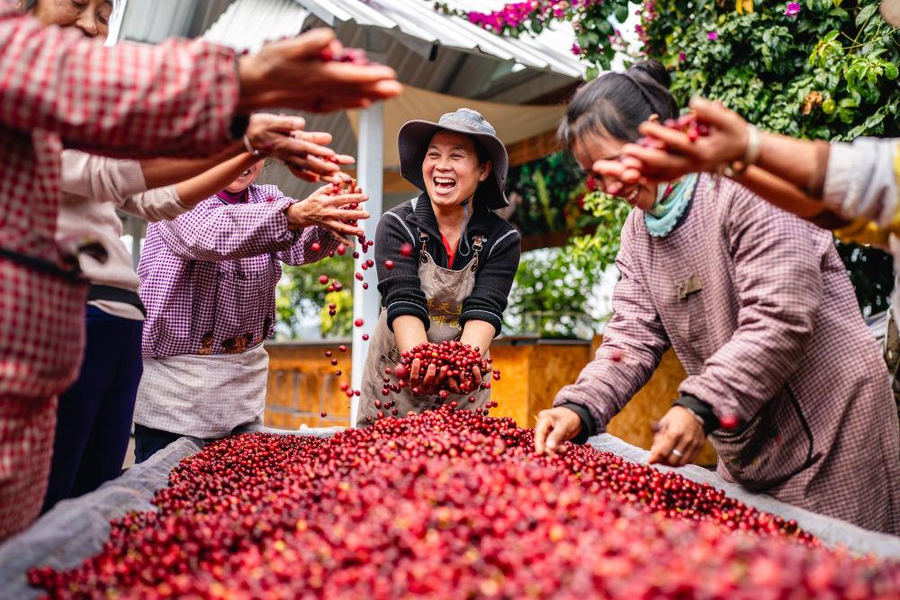 2025年1月8日,在云南普洱思茅區(qū)一咖啡莊園,工作人員慶??Х蓉S收。