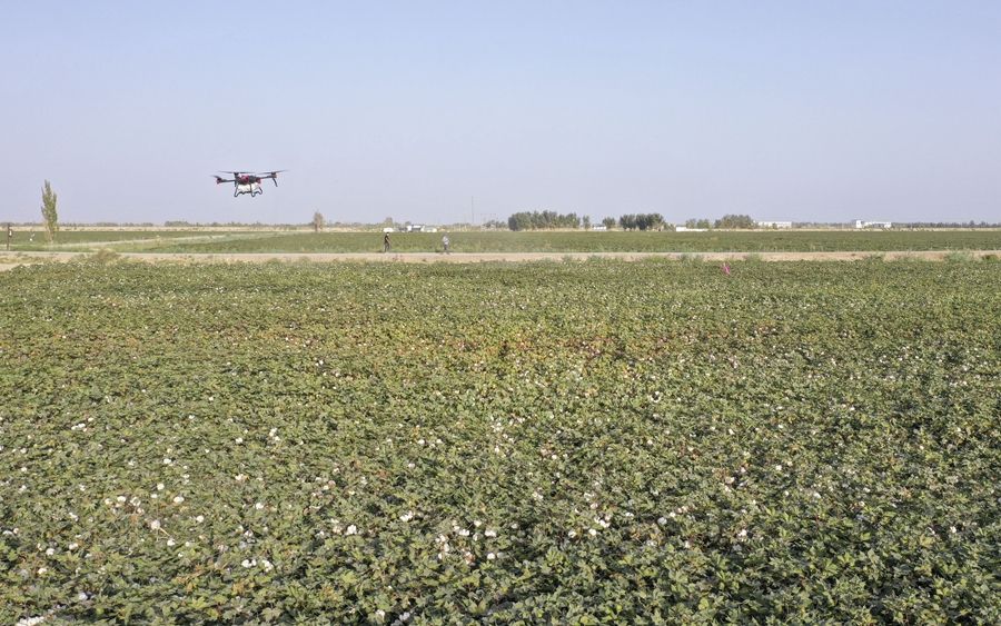在新疆尉犁縣興平鎮(zhèn)達西村一處高標準農田,種植戶用無人機噴灑脫葉劑(2022年9月20日攝,無人機照片)。新華社發(fā)(汪志鵬 攝)