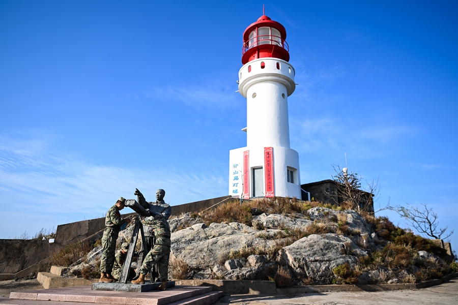 開(kāi)山島守島民兵保養(yǎng)清潔王繼才雕像(2024年10月25日攝)。新華社記者 鄧華 攝