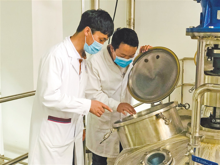 仁增(左一)和同事正在查看提取罐中的藏藥浴藥材。