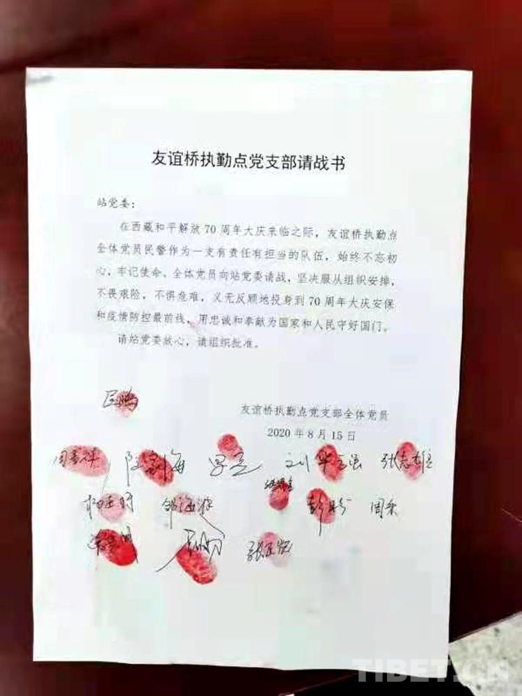 8月15日,聶拉木出入境邊防檢查站友誼橋執(zhí)勤點(diǎn)18名黨員民警在接受抗疫命令后,18名隊(duì)員在界碑前列隊(duì),舉起右拳,鄭重宣誓,踴躍請(qǐng)戰(zhàn)?!霸谝咔榉揽毓ぷ髦校易栽干暾?qǐng)參與到國(guó)門(mén)一線的疫情防控工作,到口岸一線去,這是我的職責(zé)和使命……”剛分配到單位的新警李東洪在請(qǐng)戰(zhàn)書(shū)中寫(xiě)道。
