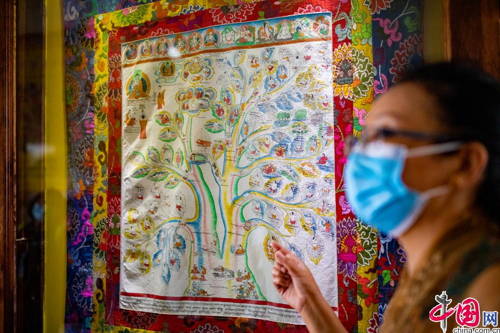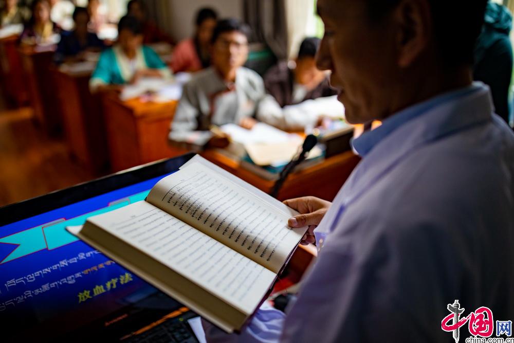 西藏藏醫(yī)藥大學(xué)開(kāi)設(shè)特色鮮明的藏醫(yī)藥學(xué)唐卡教學(xué)課程。現(xiàn)有醫(yī)學(xué)唐卡由十七世紀(jì)藏醫(yī)藥大家第司.桑杰嘉措創(chuàng)建,距今已有300多年的歷史。醫(yī)學(xué)唐卡用歸納、總結(jié)的方式將藏醫(yī)藥典籍《四部醫(yī)典》的主要內(nèi)容以“樹(shù)喻”方式繪示出來(lái)。成書于1300多年的《四部醫(yī)典》是藏醫(yī)藥學(xué)理論的根本大典。包括總則醫(yī)典、論述醫(yī)典、秘訣醫(yī)典和后續(xù)醫(yī)典。內(nèi)容涵蓋藏醫(yī)生理學(xué)、病理學(xué)、診斷學(xué)、治療學(xué)等基礎(chǔ)理論,細(xì)化了婦科、兒科、內(nèi)科、外傷等學(xué)科,包含了解剖學(xué)、護(hù)理學(xué)、藥學(xué)等眾多學(xué)科。圖為學(xué)校老師在對(duì)醫(yī)學(xué)唐卡進(jìn)行講解。中國(guó)網(wǎng)記者 鄭亮攝