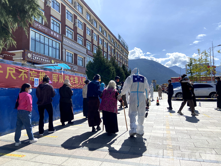 林芝邊境管理支隊(duì)輪訓(xùn)隊(duì)民警孫震正攙扶行動(dòng)不便的老人前往核酸檢測(cè)點(diǎn) 攝影:任遠(yuǎn)波