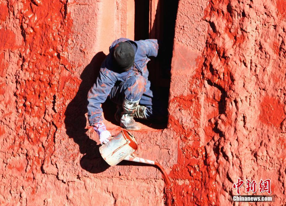 布達(dá)拉宮管理處維修科工作人員開始對紅宮進(jìn)行粉刷。中新社記者 趙延 攝