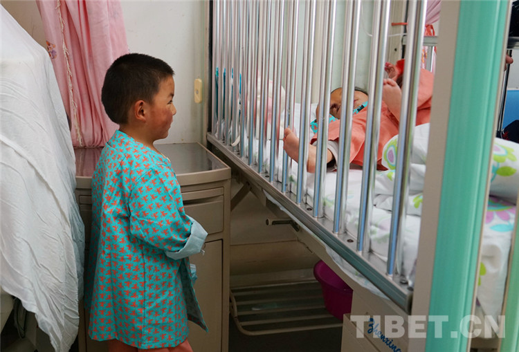 在記者采訪過程中,呷瑪龍刀尼瑪閑不住地跑來跑去,一會(huì)兒跑去看病友妹妹呷絨拉姆有沒有乖乖睡覺,一會(huì)兒又拿起舅舅的手機(jī)刷小視頻,還熱情地分享給護(hù)士看。