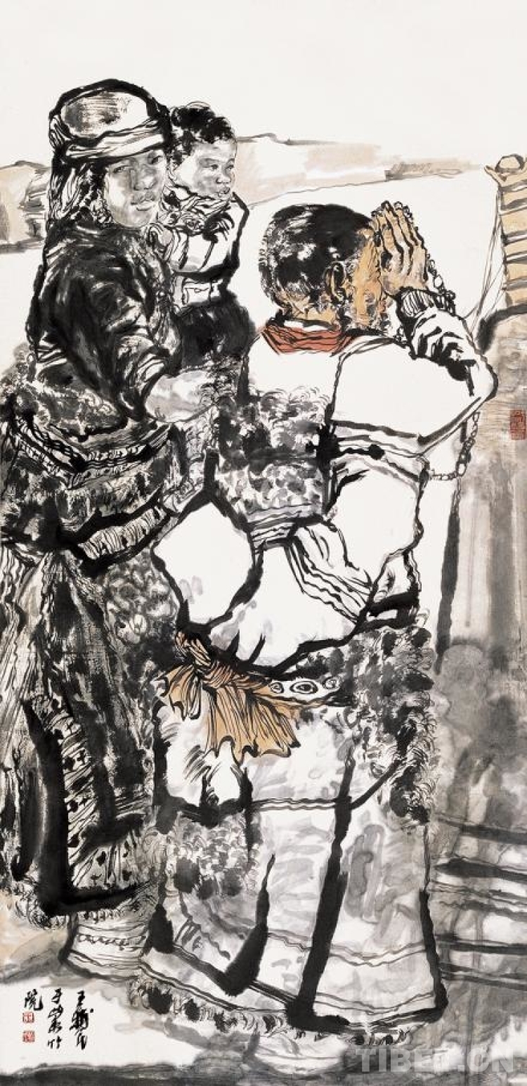 “真正深入當(dāng)?shù)厝ンw驗(yàn)藏族群眾的生活,創(chuàng)作出來(lái)的作品才會(huì)真實(shí)感人?!蓖踺o民在談到藏族題材的創(chuàng)作感悟時(shí)說(shuō),“青藏高原最吸引人的地方是生活在這里的人們飽滿的精神狀態(tài)。我們要敬畏自然,尊重文化,保持充滿感情、充滿崇敬之情的創(chuàng)作情感和態(tài)度,用中國(guó)畫(huà)的水墨形式去表現(xiàn)藏族群眾的生活,去表現(xiàn)雪域的蒼茫與藏族群眾頑強(qiáng)不屈的性格,表現(xiàn)人與自然的關(guān)系?!?/p>