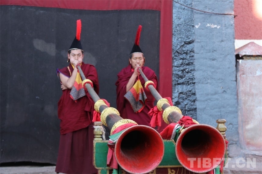 圖為從各處迎請(qǐng)出的大黑天等神像在薩迦寺院內(nèi)廣場(chǎng)匯合,跳金剛舞 攝影:王妍丹