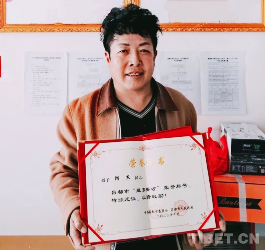 圖為朗杰被授予昌都市“藏東英才”榮譽(yù)稱號(hào)