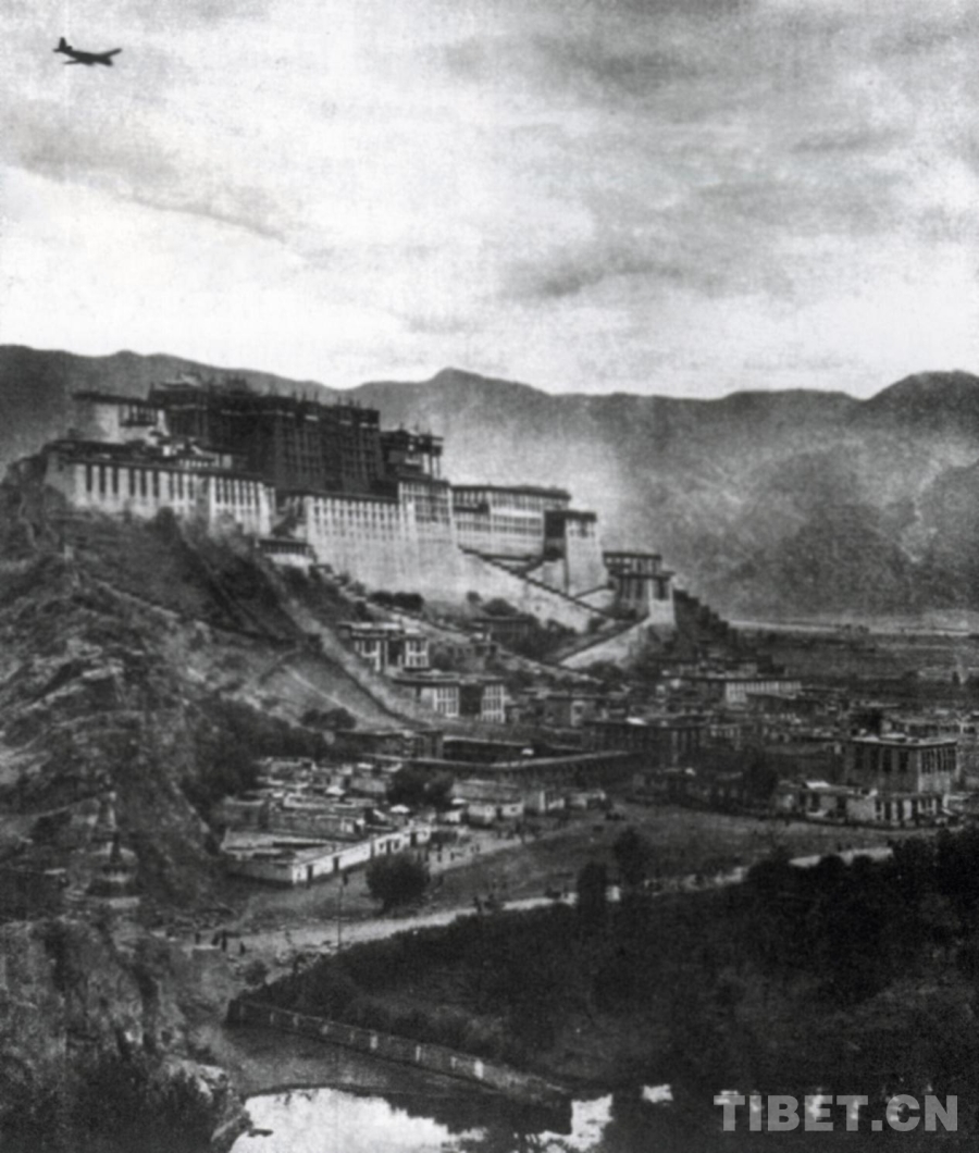 歷史照片:西藏民航飛機(jī)飛過(guò)布達(dá)拉宮。民航西藏自治區(qū)管理局供圖