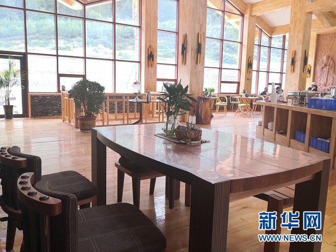 傍晚時(shí)分走進(jìn)高吉村,錯(cuò)落有致的民宿散落山間,落地窗透出暖黃色的燈光。房間里藏式床鋪與原生態(tài)家具相映成趣,靠窗的榻上擺放著茶幾、茶具、綠植,一覽無(wú)余的窗外夕陽(yáng)半落、云飛鳥散。游客接待中心也一改傳統(tǒng)樣式,樓上是純木質(zhì)、開放式餐廳,樓下是小橋流水、曲徑通幽的水景,游客們?nèi)齼蓛傻暮戎Х龋硎苤?shī)意的人生。