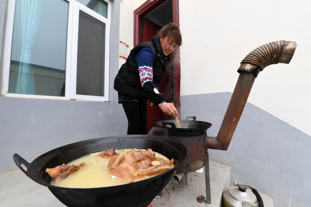 1月25日,在蘭州新區(qū)舟曲避險搬遷安置點家中小院,寧蘭玉炸油饃、煮臘肉。新華社記者 范培珅 攝