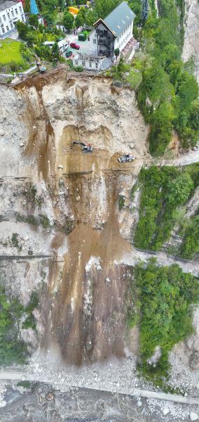 9月6日,瀘定縣磨西鎮(zhèn)通往海螺溝景區(qū)的道路被阻斷,蜀道集團施工人員在冒險搶通道路。 四川日報全媒體記者 楊樹 攝