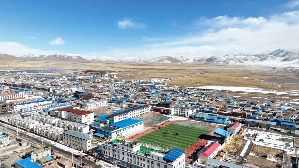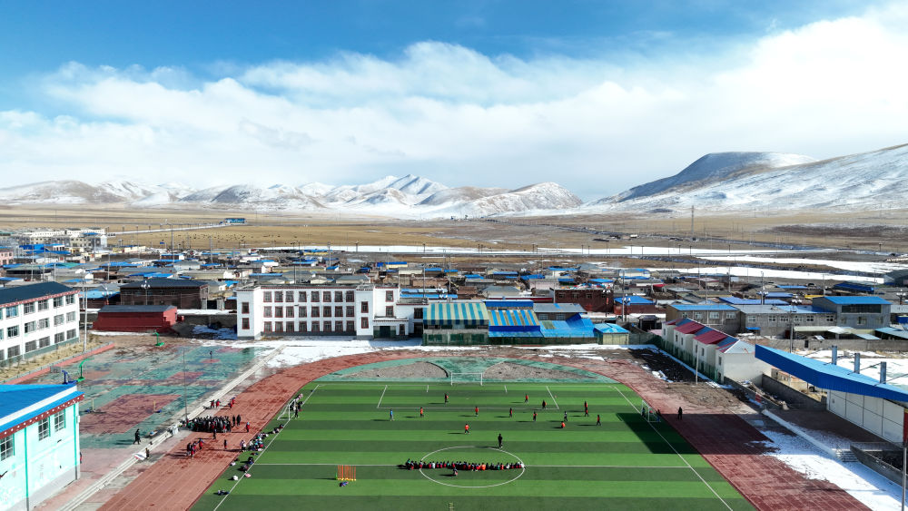 3月1日,在玉樹(shù)州曲麻萊縣,曲麻萊縣第一完全小學(xué)學(xué)生在足球課上(無(wú)人機(jī)照片)。新華社記者 張宏祥 攝