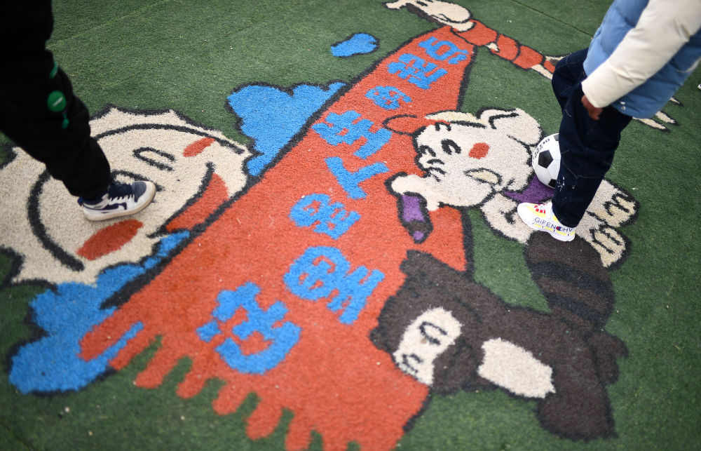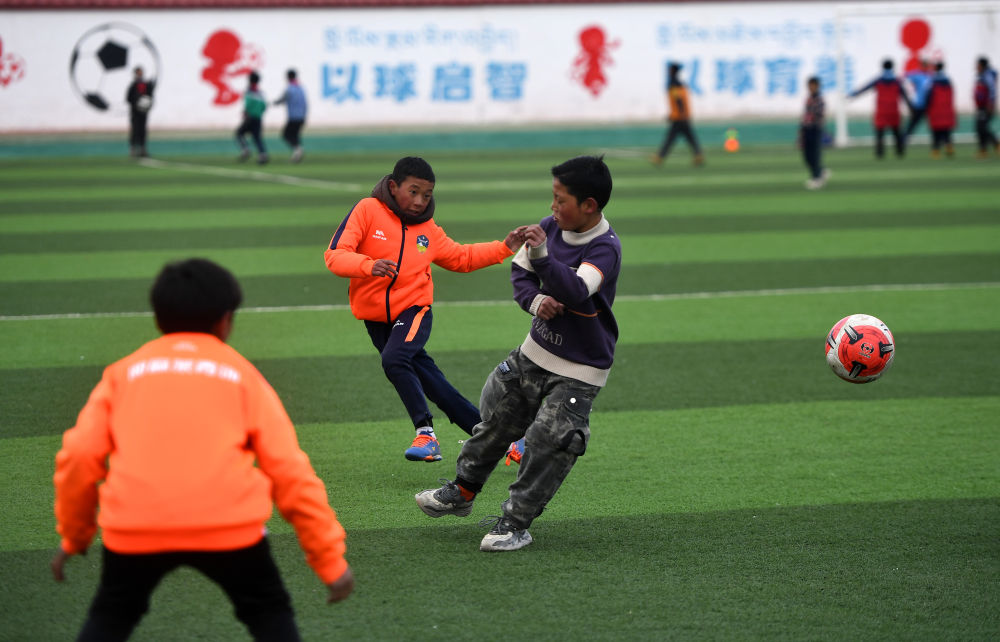 3月1日,在玉樹(shù)州治多縣,城南幼兒園小朋友桑周尼瑪(前)在練習(xí)射門(mén)。新華社記者 張宏祥 攝