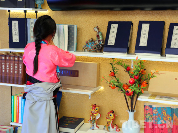 當(dāng)穿著藏裝的姑娘走過書架,翻開四大名著,努力讀出上面的文字,在古香古色的書桌前,幾個(gè)姑娘爭先用毛筆描繪著宣紙上的小楷,那畫面美得像一幅幅仕女畫。