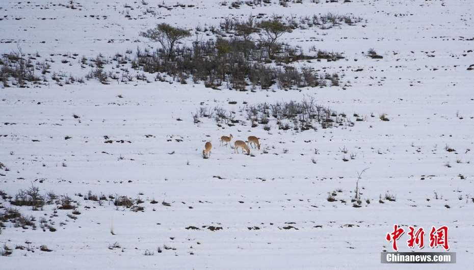 10月12日,四只普氏原羚在青海湖北岸雪中覓食。當(dāng)日,在青海湖北岸的青海省海北藏族自治州剛察縣哈爾蓋“羚羊小鎮(zhèn)”,成群的普氏原羚在雪中覓食、漫步。普氏原羚是世界瀕危物種、國家一級重點(diǎn)保護(hù)野生動物,現(xiàn)僅分布于青海湖周圍,成為青海湖獨(dú)有的珍稀有蹄類動物和旗艦物種。中新社記者 馬銘言 攝