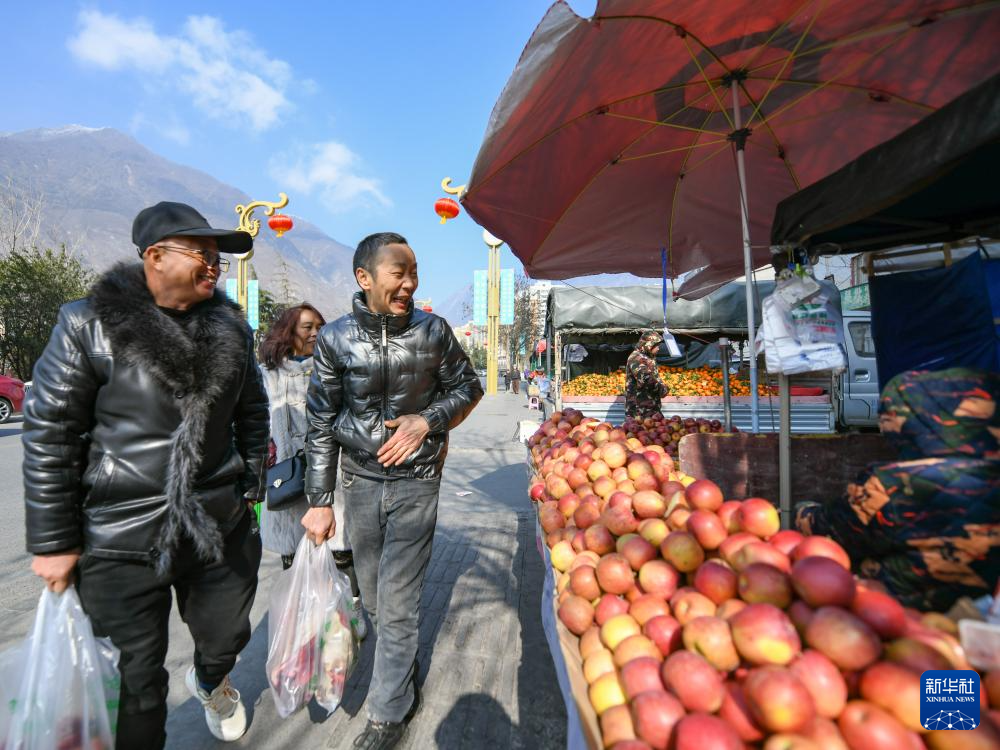 1月28日,在四川阿壩藏族羌族自治州茂縣水果交易市場,來自成都的游客在選購蘋果。新華社記者 王曦 攝