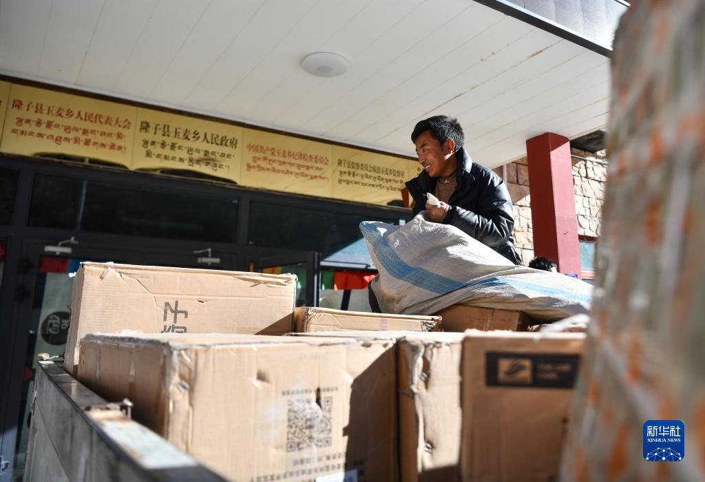 玉麥鄉(xiāng)郵遞員在搬運剛剛抵達(dá)玉麥的快遞包裹(2023年1月8日攝)。新華社記者 晉美多吉 攝
