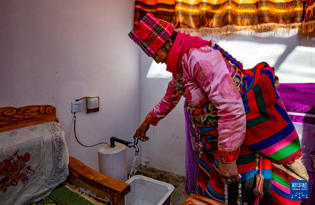 今年51歲的戶主格桑松塔說,以前冬天用水要去幾公里外的湖上鑿冰,后來要去幾百米外的機(jī)電井水房背水,自從2023年11月搬入新居,足不出戶就能用上水。他身旁,連接上水管的洗衣機(jī)正發(fā)出工作的轟隆聲。