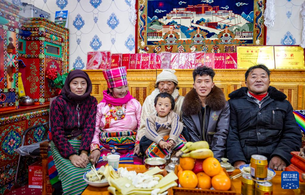 那曲市申扎縣巴扎鄉(xiāng)色尼村村民格桑松塔(右一)一家在新居合影(1月6日攝)。新華社記者 旦增尼瑪曲珠 攝