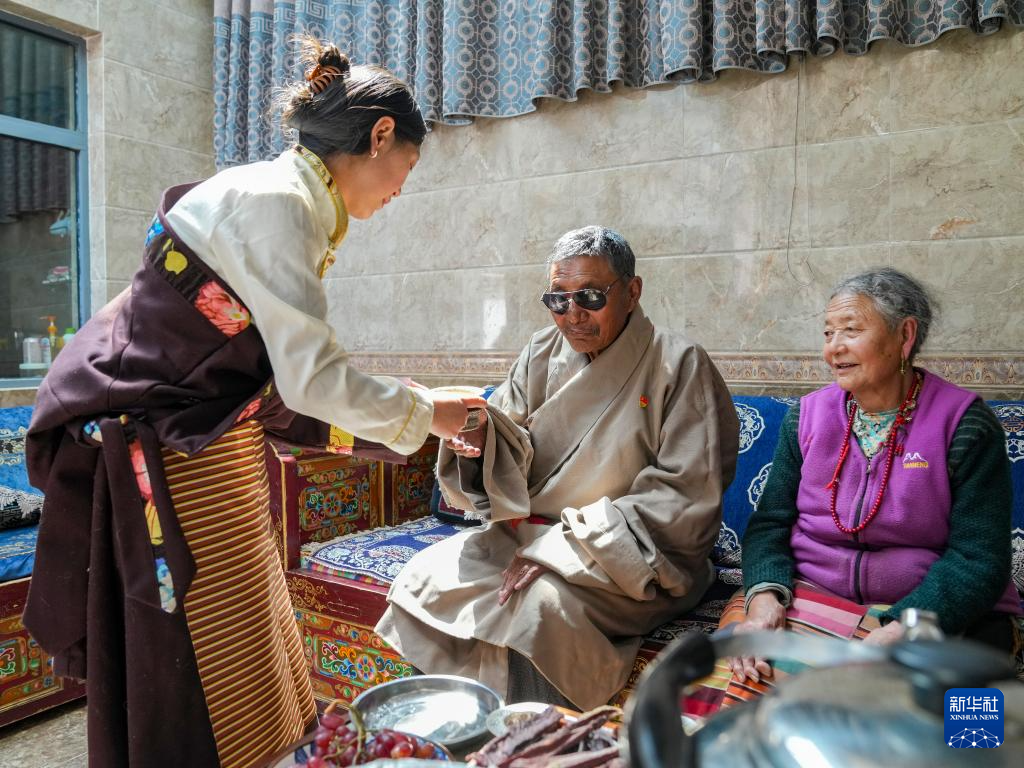白瑪的孫女嘎桑玉珍(左)為他和老伴多吉卓瑪敬酥油茶(3月27日攝)。新華社記者 丁汀 攝