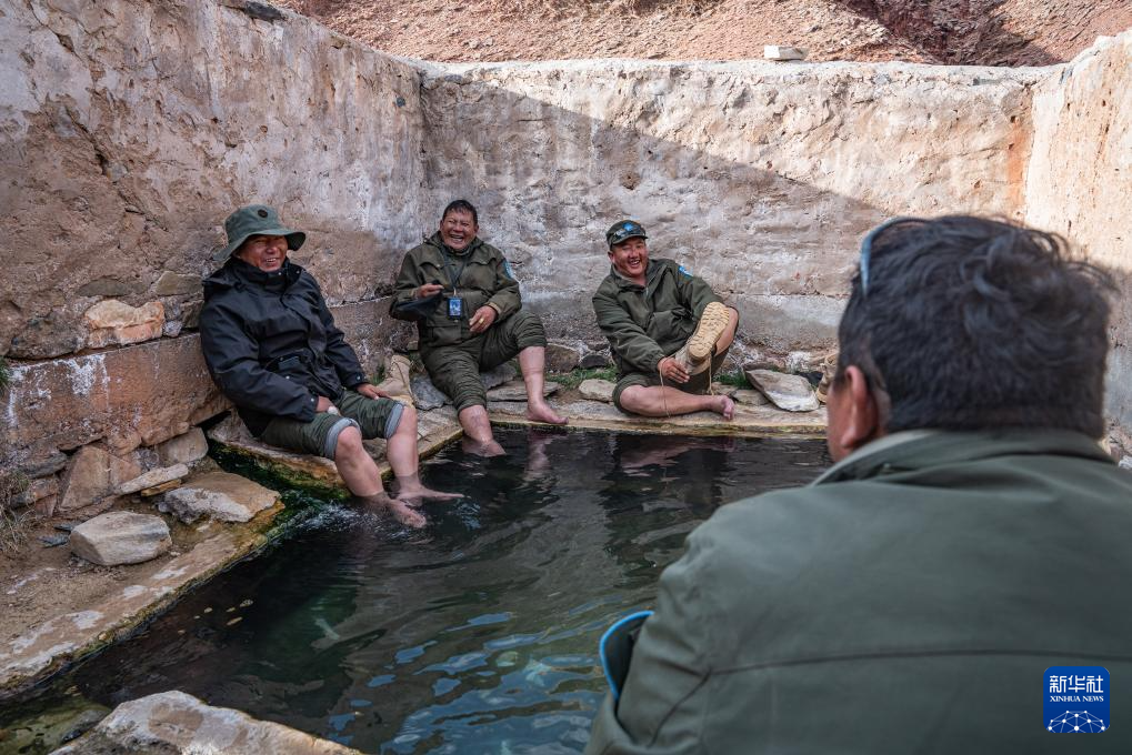 野生動物專業(yè)管護隊員們在一處廢棄的溫泉池中泡腳休息(5月8日攝)。新華社記者 丁增尼達 攝