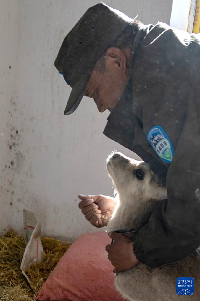 羅布玉杰站的野生動物專業(yè)管護隊員在出發(fā)巡護前給站里救護的受傷藏原羚喂糌粑(5月7日攝)。新華社記者 姜帆 攝