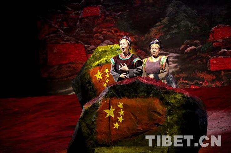 在開幕式現(xiàn)場,代表西藏近年來最高歌舞劇藝術(shù)水準(zhǔn)的開幕大劇《天邊格?;ā?,在演員們的聲情并茂講述聲中,精彩上演。歌舞劇《天邊格?;ā芬浴凹摇睘橹黝},向觀眾呈現(xiàn)出卓嘎、央宗姐妹愛國守邊的感人事跡。