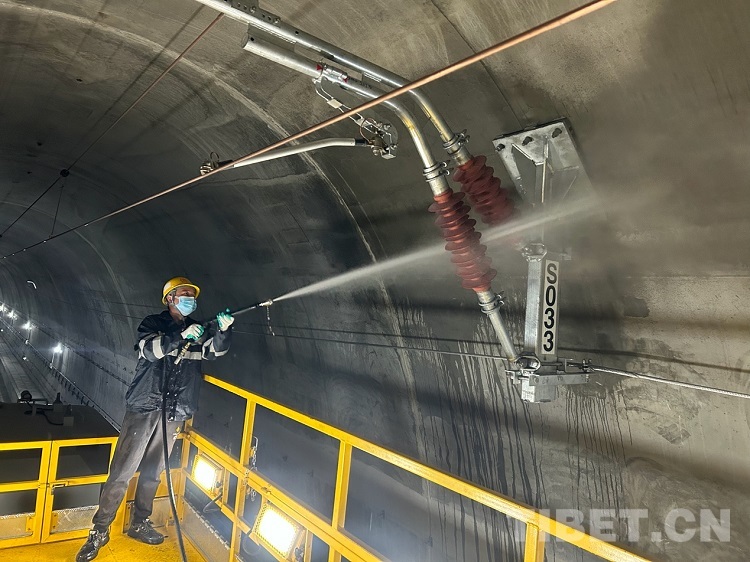 中國西藏網(wǎng)訊 初冬時(shí)節(jié),雅魯藏布江畔,秋葉繽紛、層林盡染。在穿山過江的拉林鐵路桑珠嶺隧道內(nèi)機(jī)器轟鳴、人聲鼎沸。11月14日10時(shí)25分,中國鐵路青藏集團(tuán)有限公司拉薩基礎(chǔ)設(shè)施段桑日綜合維修車間的接觸網(wǎng)工陳世召頭戴安全帽、身穿防雨服、腳踩絕緣靴,手中的高壓水槍迸射出道道白色弧線。