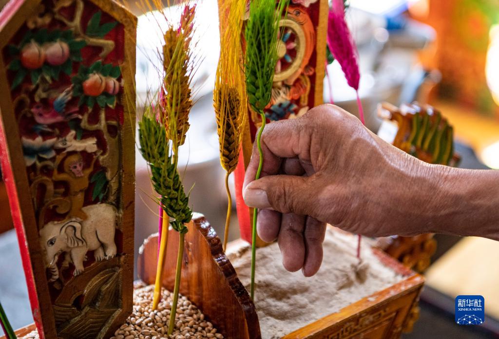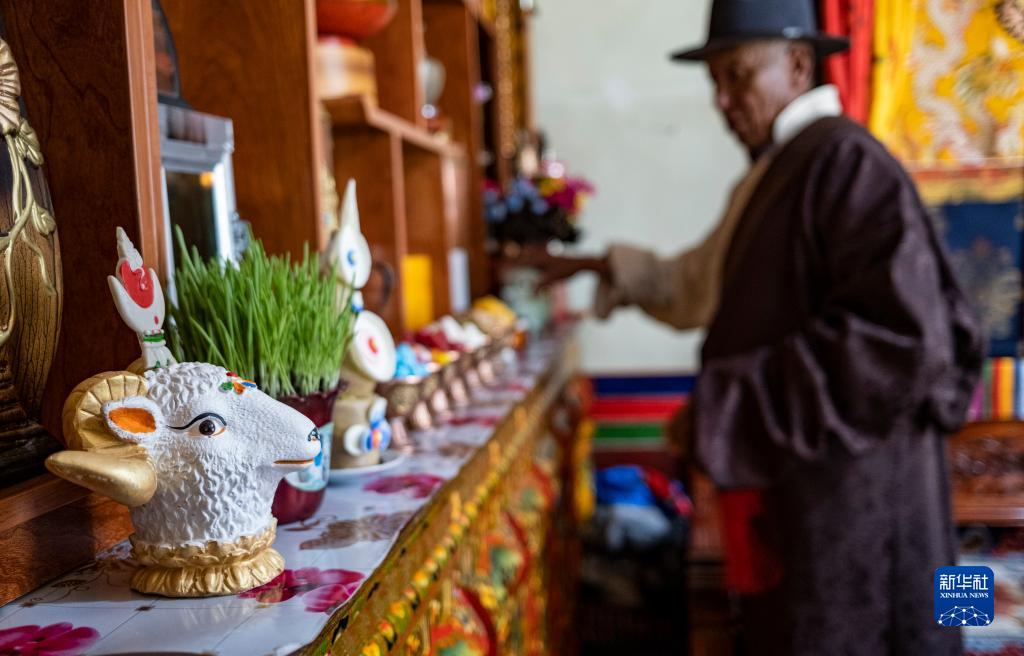 2月20日,在位于西藏拉薩市墨竹工卡縣門巴鄉(xiāng)的家中,扎西次仁用五彩青稞穗裝點象征吉祥的“切瑪”。新華社記者 孫非 攝