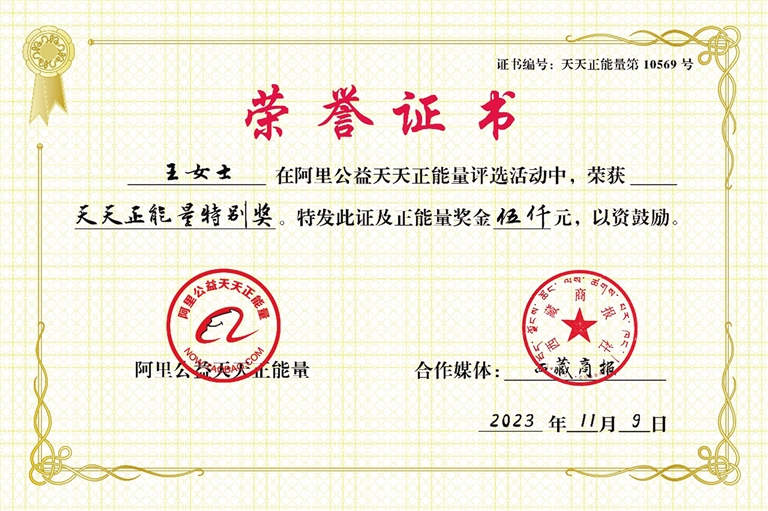 阿里公益天天正能量聯(lián)合西藏商報,為王女士頒發(fā)5000元天天正能量特別獎。感謝她的善舉,讓快要消失的“捎”字重現(xiàn)。這世間,唯有愛與信任不可辜負。