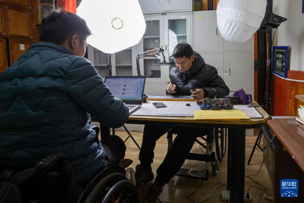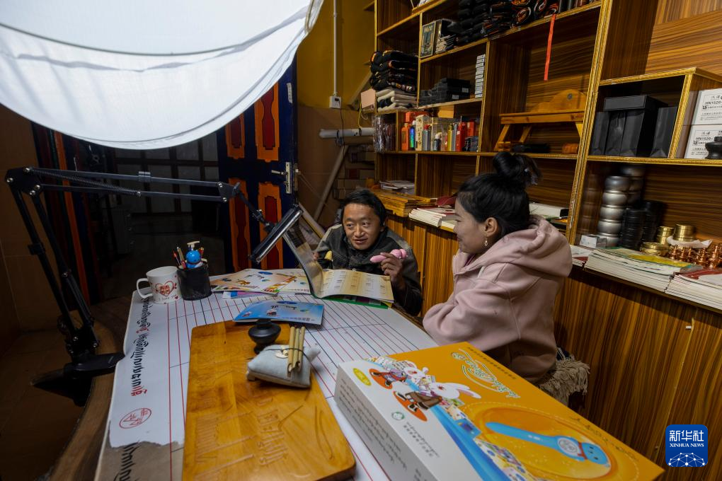 西藏拓崗文化傳播有限公司員工拉巴頓珠(左)與主播索朗德吉合作直播銷售藏語學(xué)習(xí)文具(11月10日攝)。新華社記者 姜帆 攝 ??
