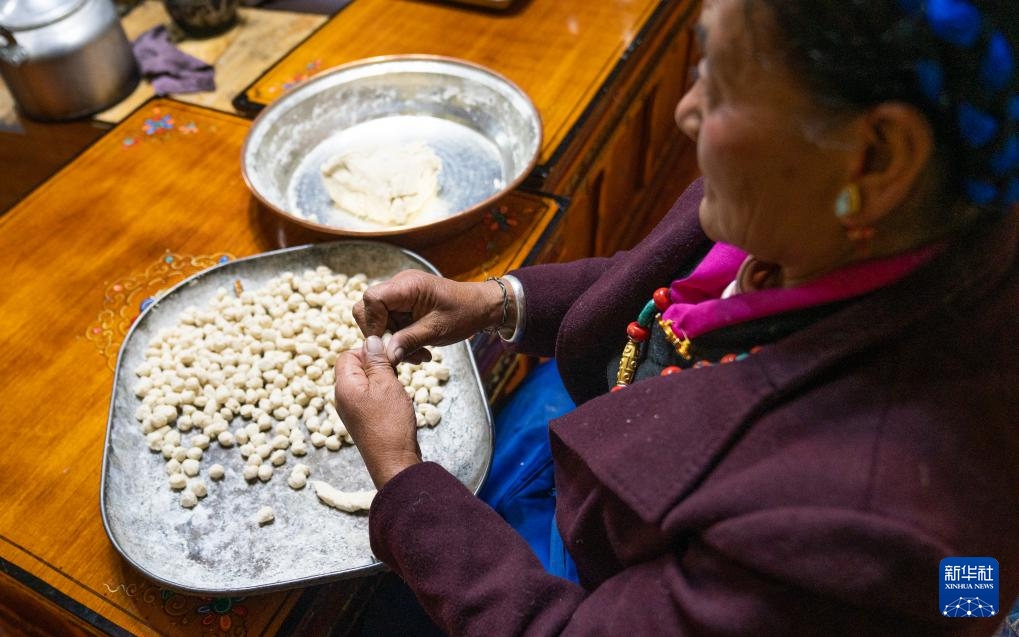 巴桑普尺在制作“古突”(1月10日攝)。新華社發(fā)(普布次仁 攝) ??