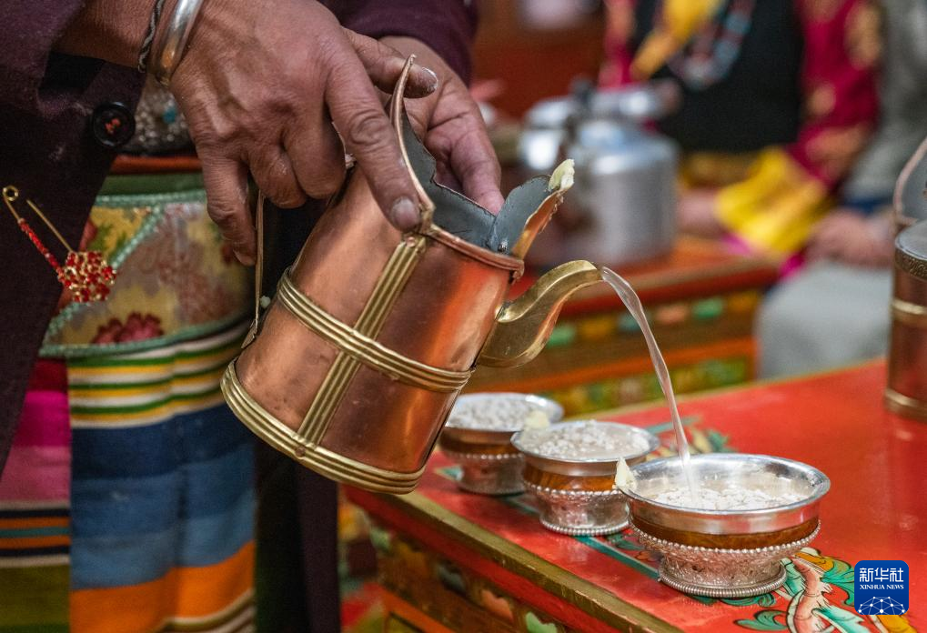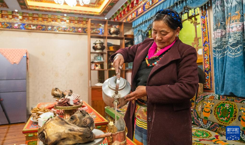 巴桑普尺在倒青稞酒(1月10日攝)。新華社發(fā)(普布次仁 攝) ??