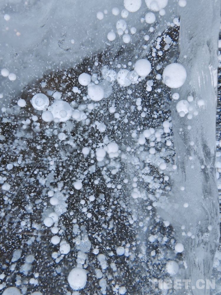 許多細(xì)小的白色氣泡懸浮在錯(cuò)那湖厚厚的冰層之中。帕洛扎 攝