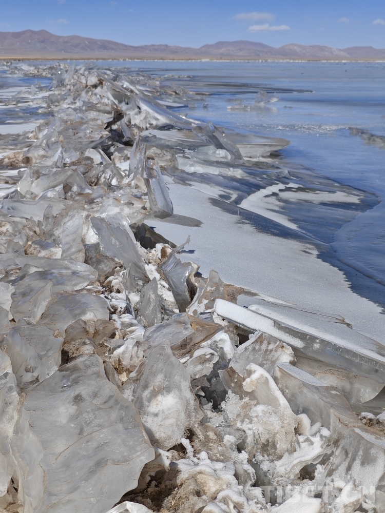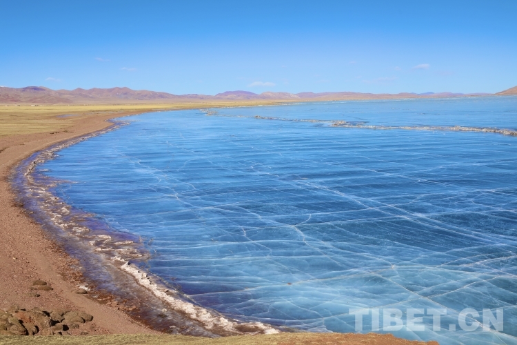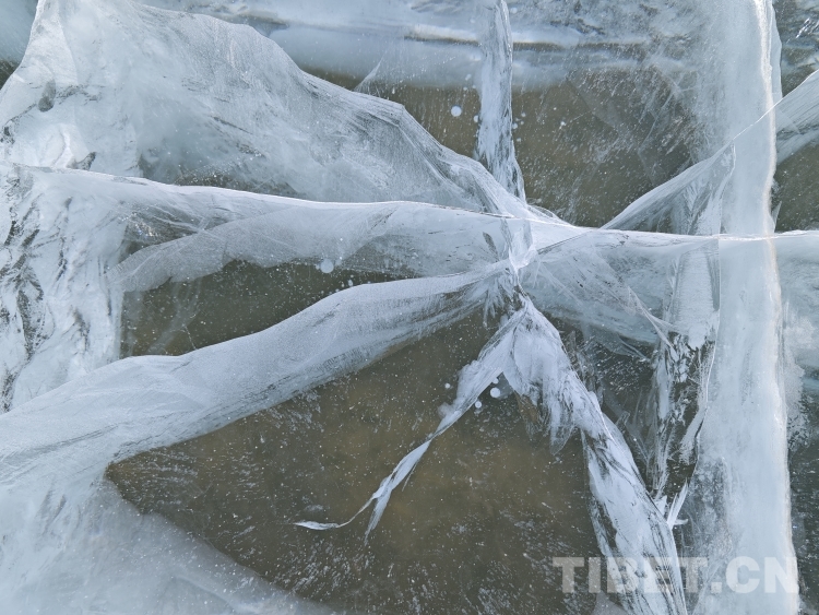 錯(cuò)那湖湖面海拔4600米左右,面積400多平方公里,是世界上海拔最高的淡水湖,更有冰泡、冰裂、冰推等奇妙的自然景觀。當(dāng)氣溫急劇下降時(shí),水溫也驟降,湖底產(chǎn)生的氣體在上升過程中被凍在冰中,形成許多細(xì)小的白色氣泡,懸浮在厚厚的冰層之中。湖水表面一層被藏北的朔風(fēng)快速凍結(jié)成冰,部分碎冰在岸邊堆積,形成隆起的“冰岸線”。又由于初春晝夜溫差較大,湖冰崩裂,形成網(wǎng)狀的冰裂紋路。這些透明裂紋從岸邊開始,像潮水一樣漫過平地,漫過羌塘草原腹地,漫到天邊,把羌塘大地裝扮成一個(gè)冰晶縱橫交錯(cuò)的世界。(中國(guó)西藏網(wǎng)文/李一凡 張萌萌 龍真多吉)